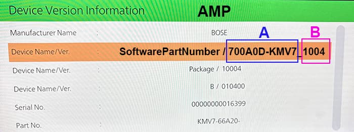AMP Model ID is shown in blue box. Software version in pink box.